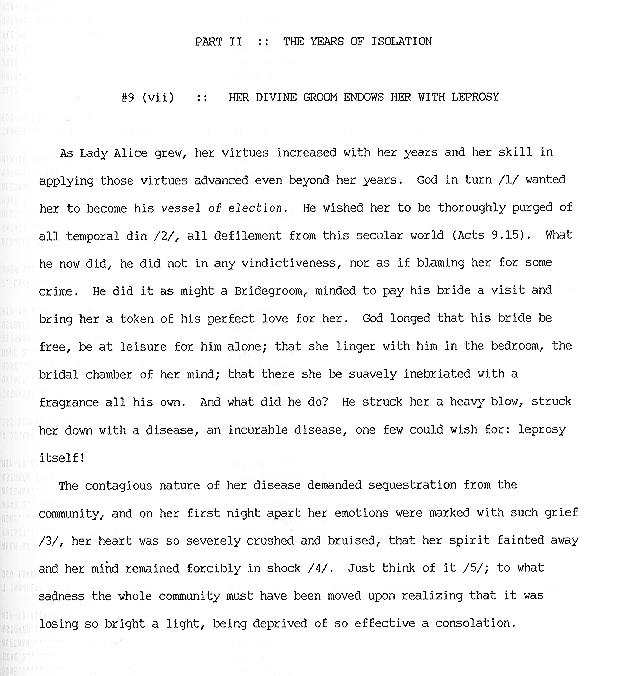 Alice died on St. Barnabus' Day, Saturday, 11 June, 1250. Cistercian monks did not hold a feast in her honor until 1702. The author of Alice's hagiography seems to be an abbot. His work is not a handbook on lepers. He ignores all biblical references to leprosy and fails to include Alice's ceremony of isolation. The author seems more interested in the manner in which Alice copes with her social isolation and moral stigma. This work appears to be an attempt to dispel the idea that leposy is a punishment from God for the leper's sins.The Life of Alice the Leper is divided into three sections. Part I, (Prologue to Section 8) narrates her pre-leprous years; Part II (Sections 9-21) discusses her years of isolation; Part III (Sections 22-34) involves her final, year-long illness. (This information from Cawley's "The Life of Alice and the Silver Age at Villers," Cistercian Scholars Quarterly.)